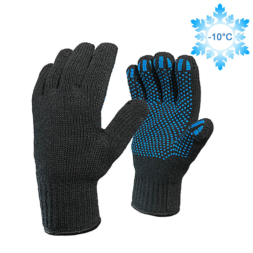 Перчатки полушерстяные 7,5 класс вязки, черного цвета с двойным оверлоком. ПВХ нанесение "Точка" в виде мелкой точки обеспечивает надежный захват. Перчатки предназначены для выполнения работ не связанных с большими механическими нагрузками на открытом воздухе при отрицательных температурах. Климатический пояс: Ⅰ, Ⅱ. Упакованы в мешки по 150 пар.